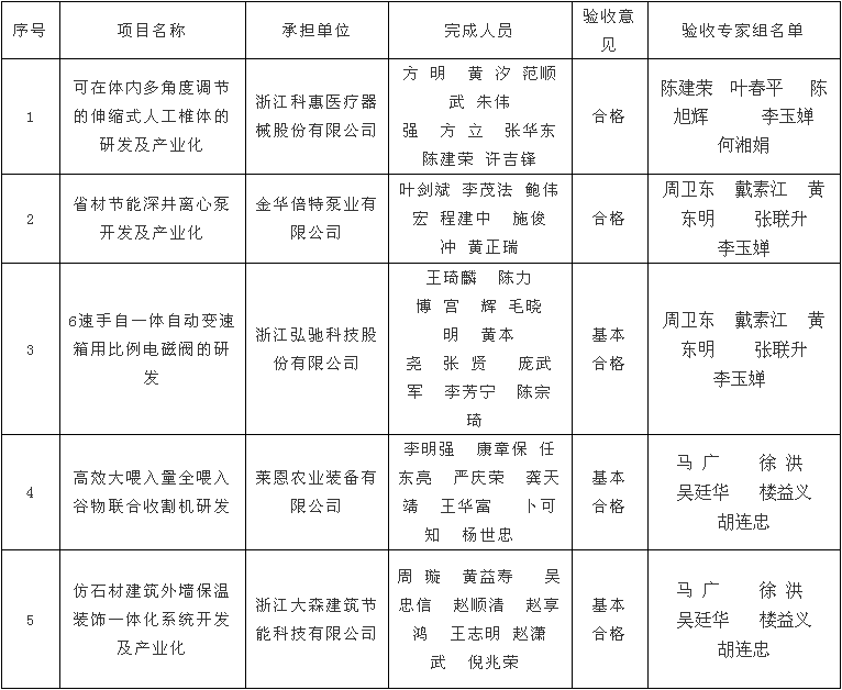 根據(jù)《金華市級(jí)科技計(jì)劃項(xiàng)目驗(yàn)收管理辦法》(金市科字〔2015〕83號(hào))規(guī)定,現(xiàn)將浙江科惠醫(yī)療器械股份有限公司、金華倍特泵業(yè)有限公司、浙江弘馳科技股份有限公司、萊恩農(nóng)業(yè)裝備有限公司、浙江大森建筑節(jié)能科技有限公司承擔(dān)的《可在體內(nèi)多角度調(diào)節(jié)的伸縮式人工椎體的研發(fā)及產(chǎn)業(yè)化》、《省材節(jié)能深井離心泵開(kāi)發(fā)及產(chǎn)業(yè)化》、《6速手自一體自動(dòng)變速箱用比例電磁閥的研發(fā)》、《高效大喂入量全喂入谷物聯(lián)合收割機(jī)研發(fā)》、《仿石材建筑外墻保溫裝飾一體化系統(tǒng)開(kāi)發(fā)及產(chǎn)業(yè)化》5個(gè)市級(jí)科技計(jì)劃項(xiàng)目驗(yàn)收結(jié)果予以公示,接受社會(huì)監(jiān)督,公示期從2017年9月26日至10月8日止。任何單位和個(gè)人對(duì)驗(yàn)收意見(jiàn)持有異議的,應(yīng)當(dāng)在公示期內(nèi)書(shū)面向市科技局提出異議,單位應(yīng)采用書(shū)面形式并加蓋公章,個(gè)人應(yīng)采用實(shí)名提出異議。