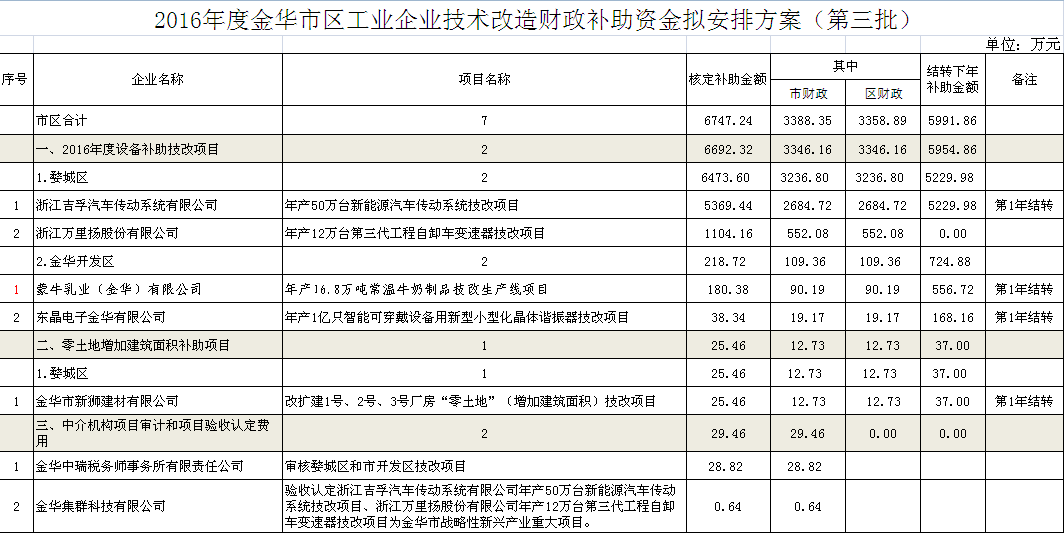 詳見(jiàn)附件:2016年度金華市區(qū)工業(yè)企業(yè)技術(shù)改造財(cái)政補(bǔ)助資金擬安排方案。