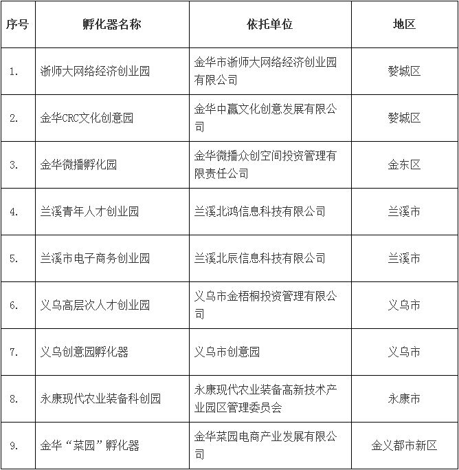 根據(jù)《金華市級科技孵化器認定與管理辦法》(金市科字〔2010〕66號)規(guī)定,我局組織開展了2018年第一批科技孵化器的認定工作,經(jīng)縣(市、區(qū))推薦、業(yè)務處室審核及專家評審,現(xiàn)將擬認定的9家科技孵化器予以公示,接受社會監(jiān)督。
