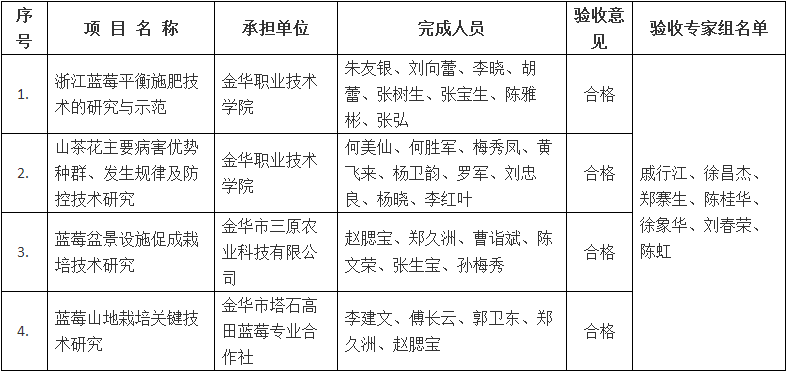 根據(jù)《金華市級科技計劃項目驗收管理辦法》(金市科字〔2015〕83號)規(guī)定,現(xiàn)將金華職業(yè)技術(shù)學(xué)院承擔的《浙江藍莓平衡施肥技術(shù)的研究與示范》等市級科技計劃項目驗收結(jié)果予以公示,接受社會監(jiān)督,公示期從2018年7月17日至2018年7月24日止。任何單位和個人對驗收意見持有異議的,應(yīng)當在公示期內(nèi)書面向市科技局提出異議,單位應(yīng)采用書面形式并加蓋公章,個人應(yīng)采用實名提出異議。