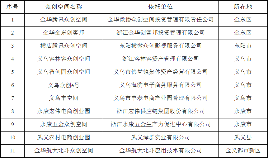 根據(jù)《金華市眾創(chuàng)空間管理辦法(試行)》(金市科〔2016〕70號)規(guī)定,經(jīng)研究,同意金華騰訊眾創(chuàng)空間等11家單位備案為金華市眾創(chuàng)空間。