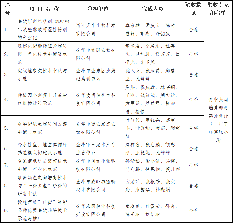 金華市級(jí)農(nóng)業(yè)科技成果轉(zhuǎn)化項(xiàng)目驗(yàn)收結(jié)果公示清單