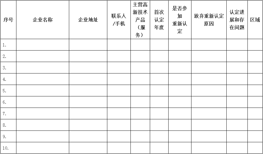 請(qǐng)各縣(市、區(qū))科技局和開(kāi)發(fā)主體科技主管部門(mén)盡早謀劃、精心組織、狠抓落實(shí)、確保實(shí)效,并從1月開(kāi)始,于每月15日、30日前填報(bào)《金華市新申報(bào)國(guó)家高新技術(shù)企業(yè)清單》(見(jiàn)附件1)報(bào)市科技局工業(yè)與高新技術(shù)處備案。